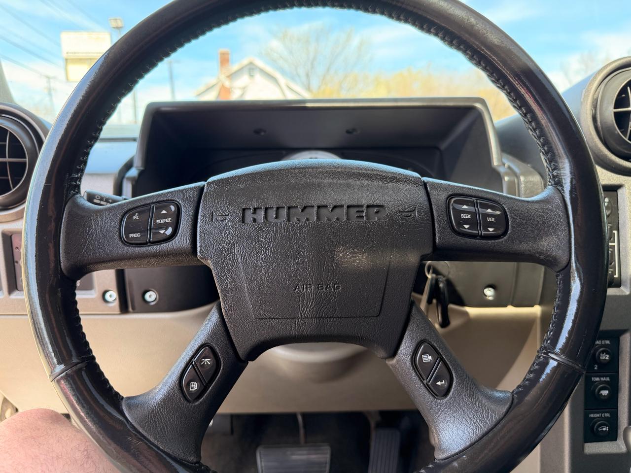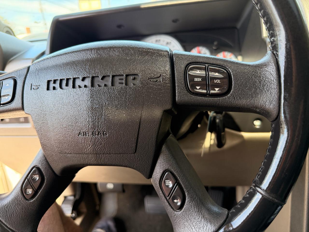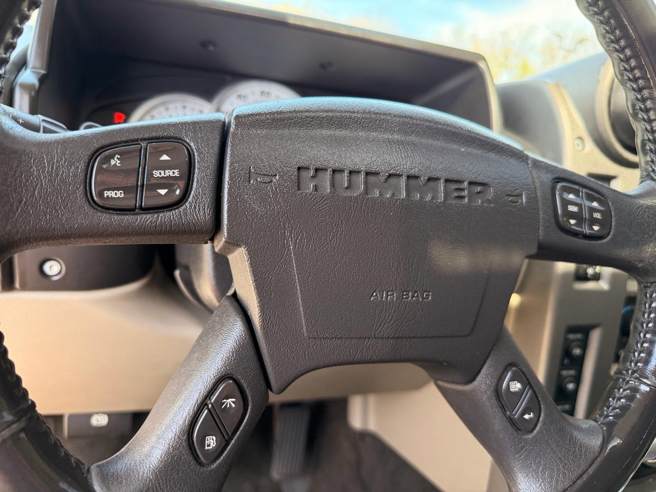 Equipped with features like heavy-duty trailering equipment, recovery hooks, and a 4-wheel disc hydraulic power brake system, this H2 is as versatile as it is tough. The interior boasts amenities like dual-zone automatic climate control, a leather-wrapped steering wheel, and a convenient HomeLink universal transmitter for added comfort and convenience. Stay connected and informed with the included OnStar 1-year Safe & Sound Service for peace of mind on your journeys.